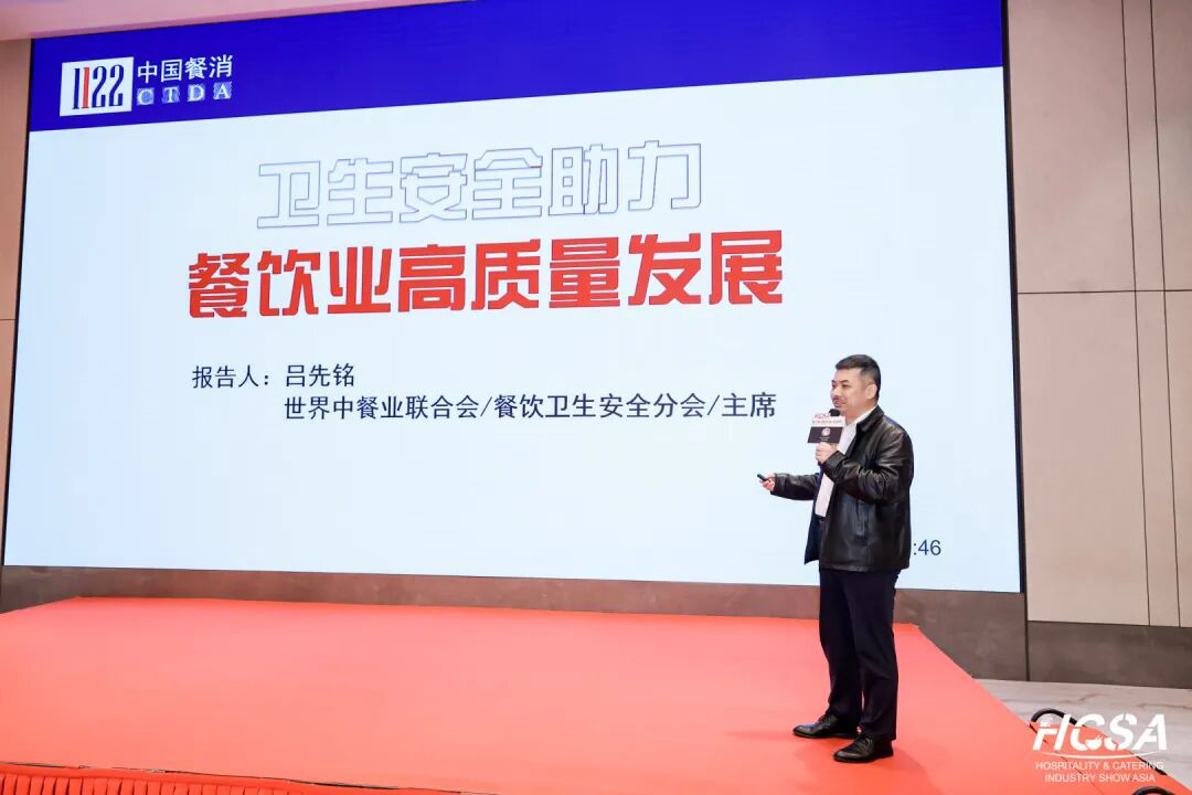 随后,世界中餐业联合会餐饮卫生安全分会主席吕先铭分享了题为《卫生安全助力餐饮业高质量发展》,阐述了卫生安全在推动餐饮业高质量发展中的重要作用。