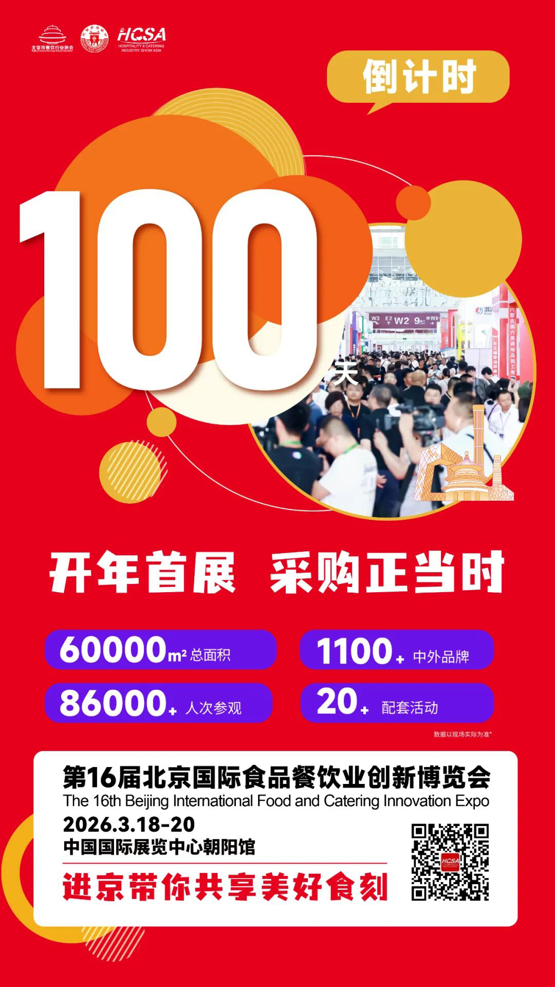 步履不停,聚力再启!在2026年以更大的规模、更全的品类、更前沿的视野,搭建酒店、餐饮及食品全产业链一站式采购、交流、共赢平台。今天,我们正式进入第十六届北京国际食品餐饮业创新博览会(第十六届北京餐博会)倒计时100天!