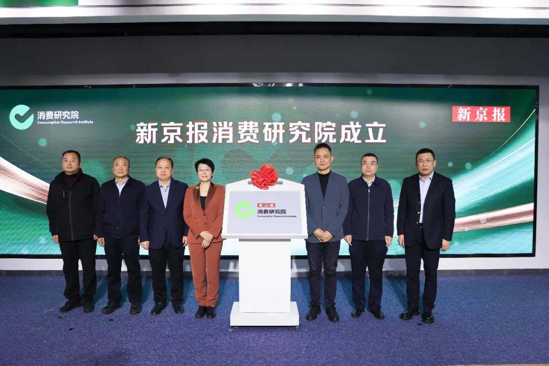 国家市场监管总局新闻宣传司司长王秋苹(左四),新京报社党委书记、社长汤一原(右三)北京市餐饮行业协会会长贾飞跃(右二)及北京市市场监管局、北京市商务局、河北省市场监管局等领导,一同为新成立的新京报消费研究院揭牌。